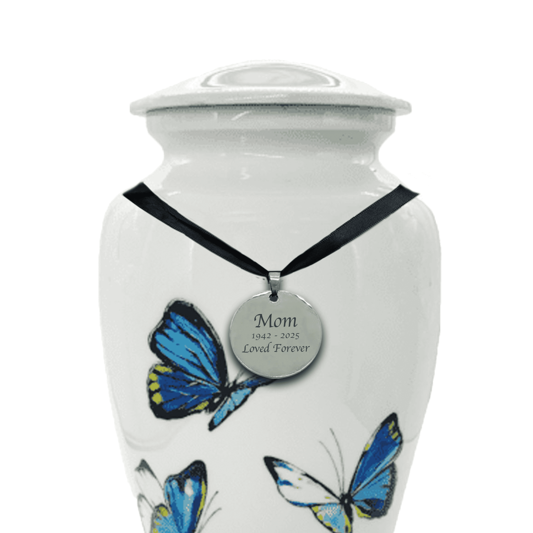 Lightweight yet durable, the urn is crafted from high-quality aluminum and features a secure threaded lid for safe and lasting closure. The soft contrast between the white background and the vibrant blue butterflies creates a calming, ethereal effect, making it a touching memorial for a loved one who brought lightness and beauty to the lives of others.