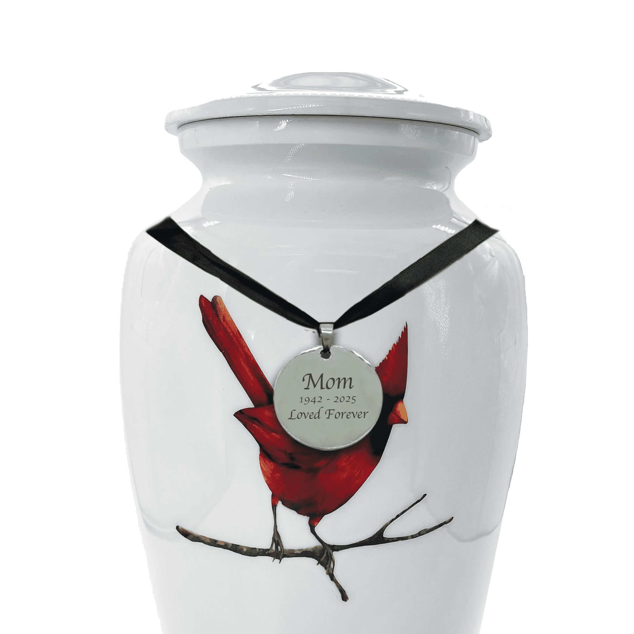 This beautifully crafted aluminum cremation urn features a striking image of a vibrant red cardinal. The glossy finish enhances the rich colors and lifelike detail of the cardinal, often seen as a comforting sign from a loved one who has passed. Made from high-quality aluminum, the urn is both lightweight and durable, with a secure threaded lid to ensure safe, long-term closure.