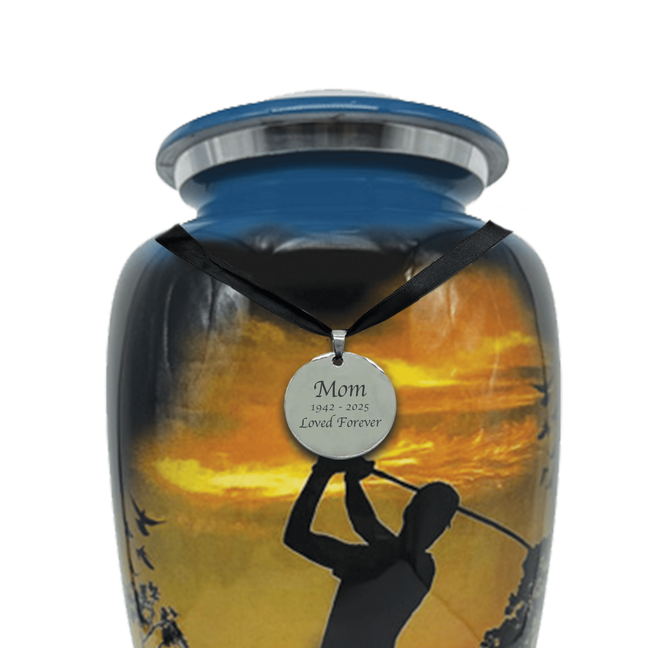 Celebrate a life defined by passion, precision, and peaceful moments on the course with our Golfer Memorial Urn. This beautifully crafted urn features a striking silhouette of a golfer mid-swing, set against a radiant sunset sky in warm hues of gold, amber, and deep blue. The serene landscape and glowing horizon create a heartfelt tribute to someone who found joy in the game and solace in the outdoors.