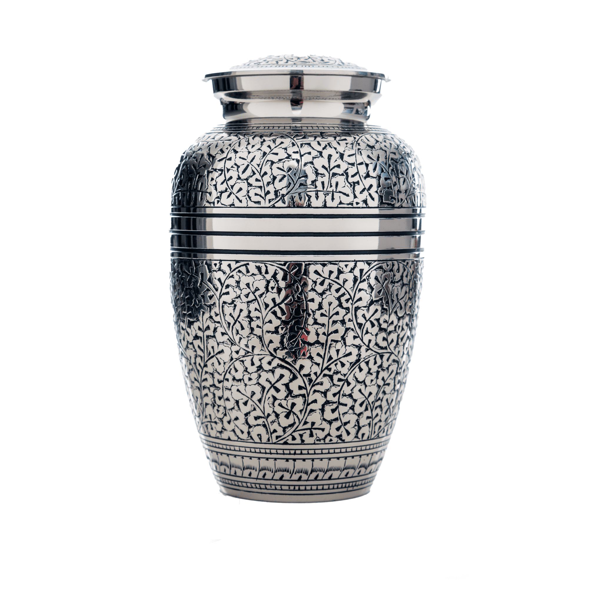 A brass cremation urn for ashes featuring a pattern of oak leaves in silver.